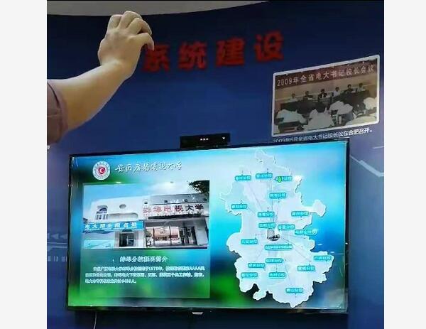 體感互動,設備識別手勢操作,來操控觸摸設備,讓人體驗隔空遠距離來互動體驗設備。展現出展廳的科技感。